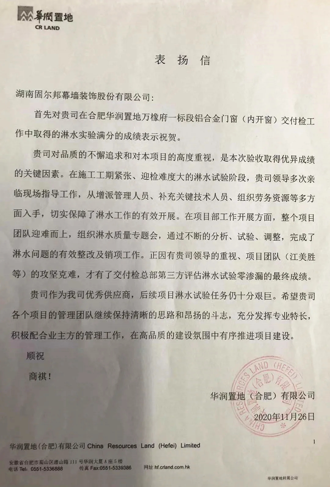 合肥华润置地万象府项目铝合金门窗交付检工作中淋水实验满分